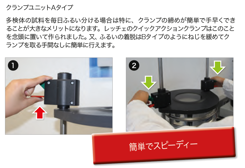 クイックアクションクランプ(レバー)で試験ふるいを固定する方式です。